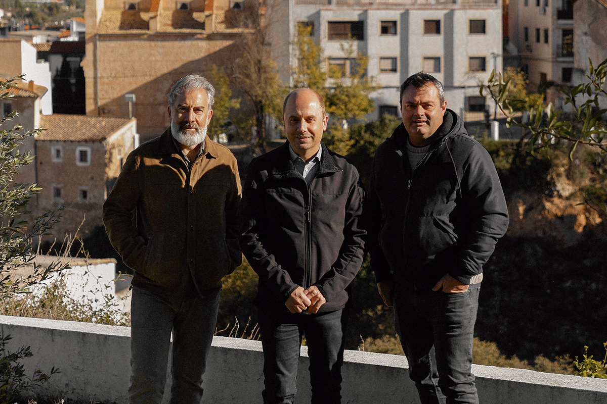 Pablo Calatayud y Vicente Ferrero —propietario y enólogo de Celler del Roure— posan junto al alcalde de Moixent, Guillermo Jorques.